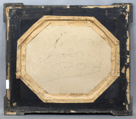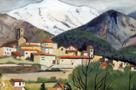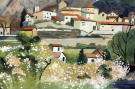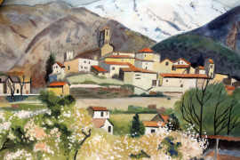 Veduta di paese montano, tecnica mista su carta, cm. 50x60, ad assetto ovale, entro cornice.