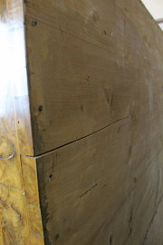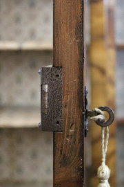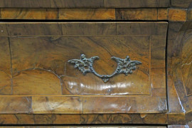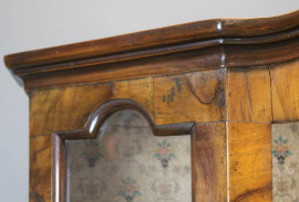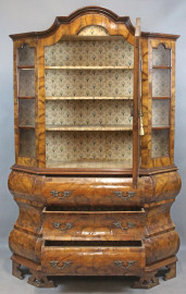 Vetrina a doppio corpo di linea bombata, in legno impiallacciatto, fronte ad uno sportello di linea centinata e tre cassetti sottostanti, piedi a mensola, cm h 184x115x37, XIX secolo