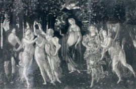 Antica stampa raffigurante La Primavera di Botticelli, cm 54x89, entro cornice.