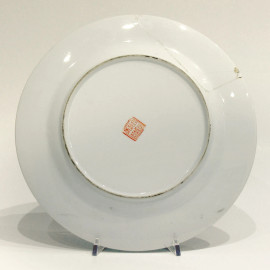 Antico piatto in porcellana cinese, tarda Dinastia Repubblica Popolare Cinese (XX sec.), finemente dipinto a mano, diametro cm 27, al retro marchio dinastico in lacca rossa, Cina Popolare