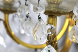 Applique in metallo dorato a tre luci, gocce in vetro, XX secolo, cm h 30.