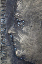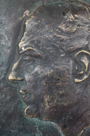 Assen Peikov, lotto di due lastre quadrate in bronzo lavorate a bassorilievo e raffiguranti profili maschili, cm 10,5x10,5, (lievi difetti).