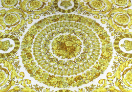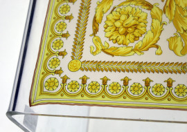 Basso tavolino con struttura in plexiglass e piano con foulard Atelier Versace, cm h 44x90x94,5, (difetti).