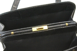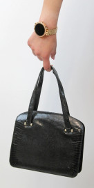 Borsetta nera, due tasche interne e comparto centrale con chiusura in metallo dorato, misure cm 19x22,5x7, (lunghezza manici cm 20), (difetti).