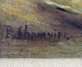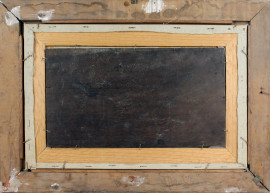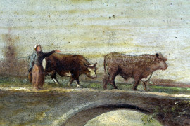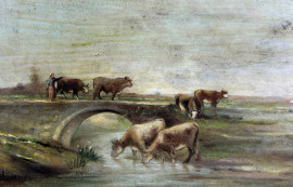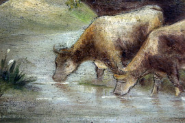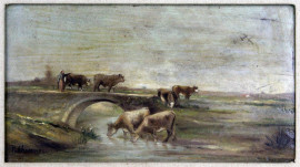 Bovini al guado, olio su tavoletta, cm 19x34,5, firmato, entro cornice