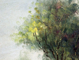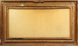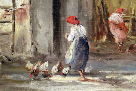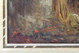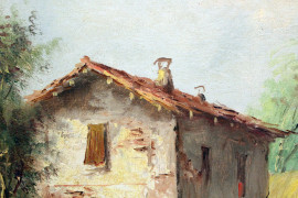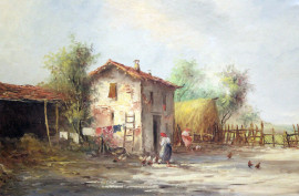Esterno di casolare con figure, olio su tela, cm 59x120, entro cornice.