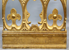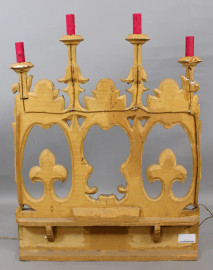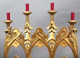 Candelabro neogotico in legno intagliato e dorato a quattro fiamme, altezza cm.80x61, (difetti e restauri)