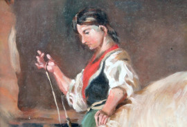 Contadina con vitello, olio su cartoncino, cm. 16x19, entro cornice