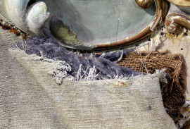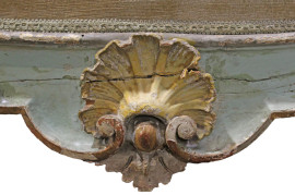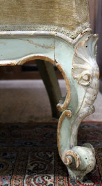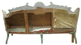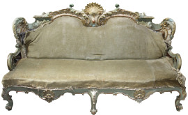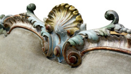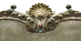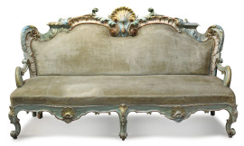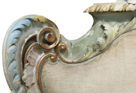 Coppia di divani in legno intagliato e laccato, XIX secolo, spalliera con cimasa scolpita a motivo di conchiglia e doppia voluta, schienale e seduta imbottiti e rivestiti in stoffa beige, piedi a ricciolo, cm h 112x193x68, (difetti).