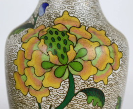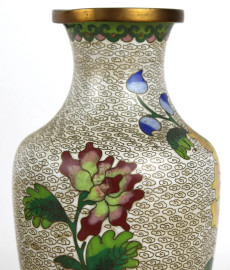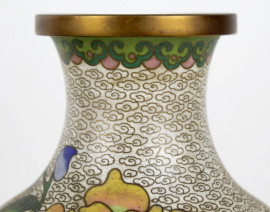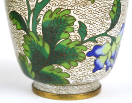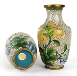 Coppia di vasi cloisonnè, con decori floreali su fondo bianco, altezza cm 20, arte orientale, metà XX secolo