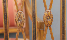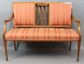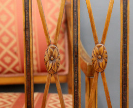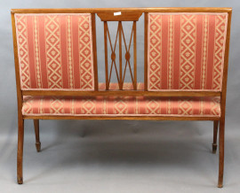 Divanetto e due poltrone in legno impiallacciato ed intarsiato, gambe ad obelisco, misure max divano cm h97,5x126x61, (difetti)