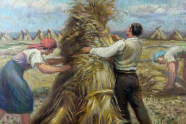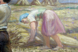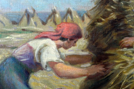 Mietitura, olio su tela, cm 68x50, datato 1947, realismo socialista, entro cornice.