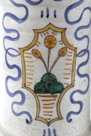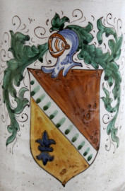 Due albarelli in maiolica policroma, decorati con stemmi araldici, altezza cm. 25,5, diametro cm. 12, marcati al retro, XX secolo.