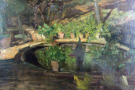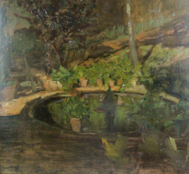 Giardino con laghetto, olio su tavola, cm.38x41, entro cornice.