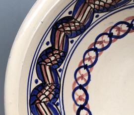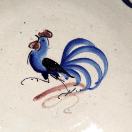 Grande centrotavola in ceramica policroma, decorato con motivi geometrici e figura di gallo, altezza cm. 18, diametro cm. 50, Nicola Fasano, Grottaglie, XX secolo, (lievi difetti).