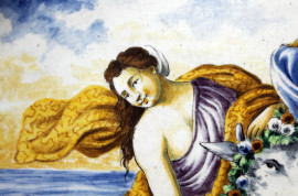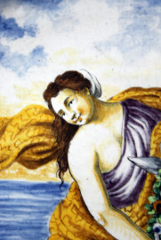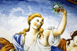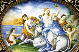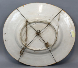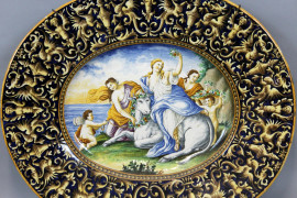 Grande piatto di linea ovale in ceramica policroma, con decoro raffigurante il Ratto di Europa, bordo a grottesche e motivi vegetali, cm 63x54, XIX secolo, (difetti)
