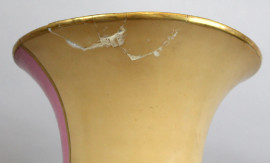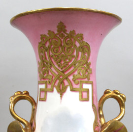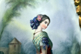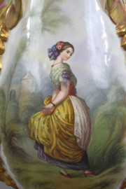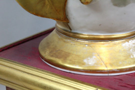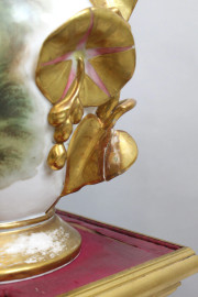 Grande vaso in porcellana policroma con decoro centrale raffigurante paesaggio con nobildonna, prese dorate a foggia di fiori e foglie, poggiante su base di linea rettangolare rivestita in tessuto bordeaux e marrone, cm h 62,5, (misure base cm 34x31x31,5), (difetti e restauri).