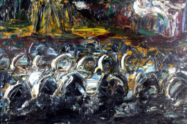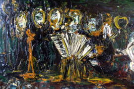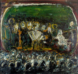 Joan Pistone, L'orchestra, olio su tavola, cm. 40x43, entro cornice.