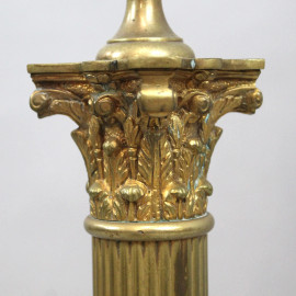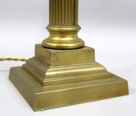 Lampada da tavolo in metallo dorato, XX secolo, fusto a colonna scanalata con capitello corinzio, base quadrata, cm h 59,5, (difetti, meccanismo da revisionare).