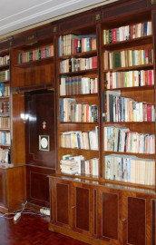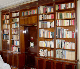 Libreria a giorno in noce, parte inferiore a quattro sportelli, parte superiore con sportello a calatoia e ventisei ripiani, cm 315 x 405 x 48.