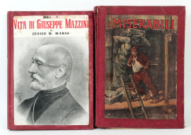 Lotto di due volumi: J.W.Mario, Della Vita di Giuseppe Mazzini, Sonzogno, Milano, 1872; I Miserabili di Victor Hugo, parte prima, Sonzogno, Milano, 1927, (difetti e mancanze)