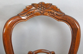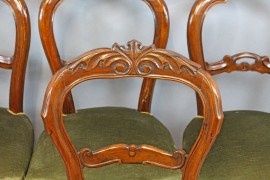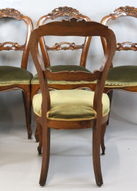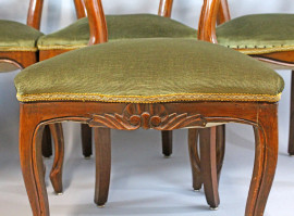 Lotto di sei sedie in noce con particolari intagliati, seduta imbottita e rivestita in velluto verde, fine XIX secolo, (restauri)