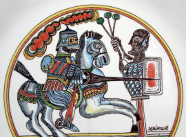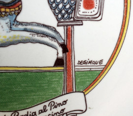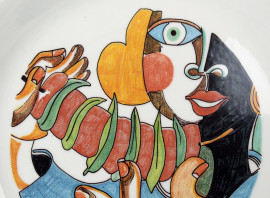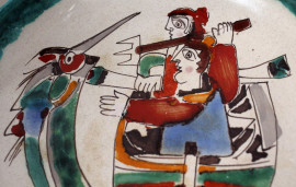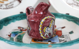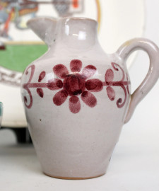 Lotto di sette oggetti in ceramica dipinta, composto da due piatti piani, un piatto fondo, tre versatoi ed un posacenere, diametro max cm 25, manifatture diverse, XX secolo.
