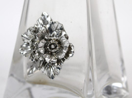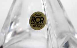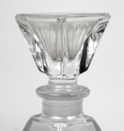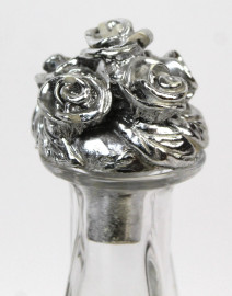 Lotto di tre bottiglie in cristallo, tappo ed applicazioni in resina argentata, alt. max cm 22, XX secolo, (difetti)