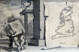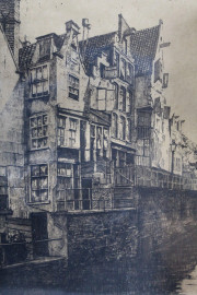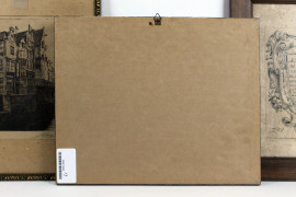 Lotto di tre stampe raffiguranti scorcio olandese, carta geografica dell'Inghilterra e iscrizione dedicatoria, misure max. cm 26,5x20, epoche diverse, entro cornici, (difetti).