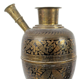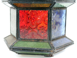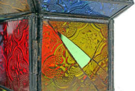 Lotto di una lanterna esagonale con vetri multicolori e un narghilè in ottone con decori di pesci e foglie, alt. max cm 37, arte orientale, XX secolo.