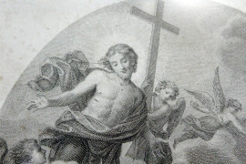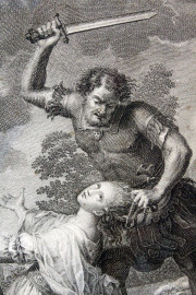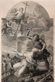 Martirio di Santa Barbara, incisione, cm 48x26, Angelo Campanella incisore, Pietro Tedeschi disegnatore, Gian Andrea Lazzarini inventore, XVIII secolo, entro cornice