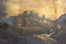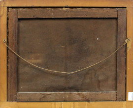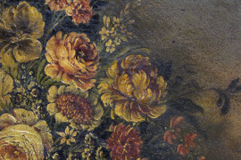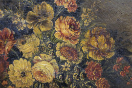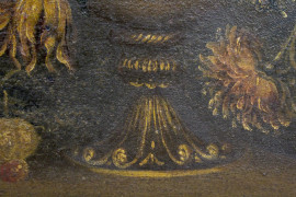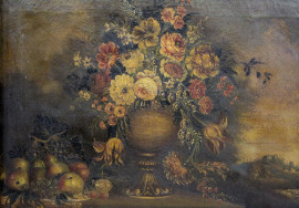 Natura morta, vaso con fiori e frutta, olio su tela, cm 63x80, XIX secolo, entro cornice, (difetti alla tela).
