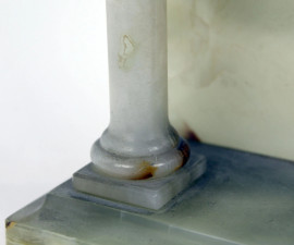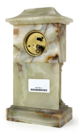 Orologio a tempietto in onice, quadrante circolare a numeri romani, cm h 29, (meccanismo da revisionare)
