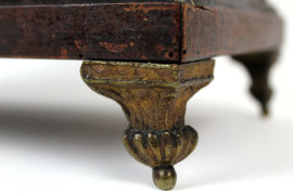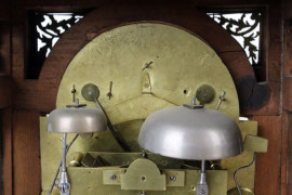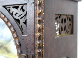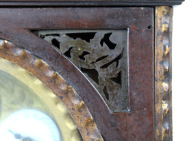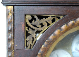 Orologio da appoggio, Austria, XVIII secolo, cassa in noce vetrata sui quattro lati, quadrante in metallo dorato a numeri romani sormontato da tre medaglioni circolari con motti e decoro raffigurante paesaggio con viandante, cm h 50x27,5x14,5