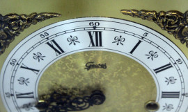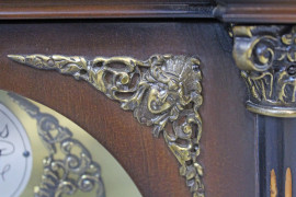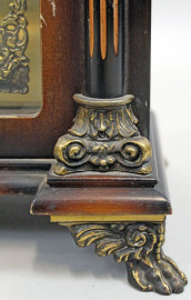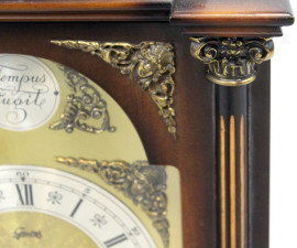 Orologio da tavolo con cassa architettonica in noce, quadrante in bronzo a numeri romani con iscrizione "Tempus Fugit", finiture e piedini in bronzo dorato, cm 42x17x30, FHS Germany, metà XX secolo, (meccanismo da revisionare, difetti).
