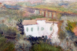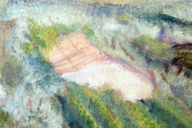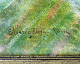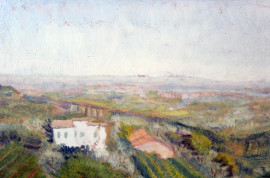 Paesaggio collinare, olio su cartone, cm 34x56, firmato, entro cornice.