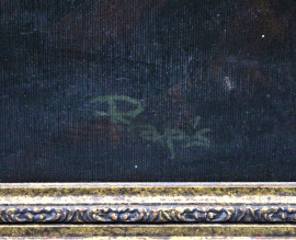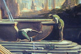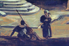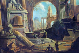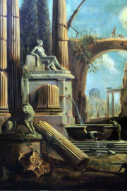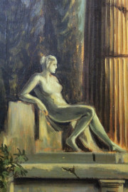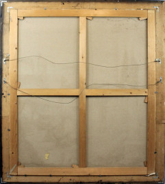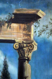 Paesaggio con architetture e figure, olio su tela, cm 150,5x130, XX secolo, entro cornice