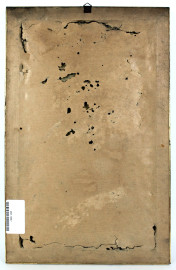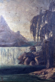 Paesaggio con cascata, olio su cartoncino applicato su tavola, cm. 38,5x23, prima metà XX secolo, entro cornice.