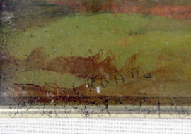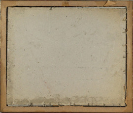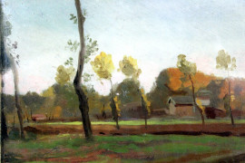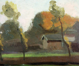 Paesaggio con casolare, olio su cartone, cm. 18x24,5, firmato, entro cornice.
