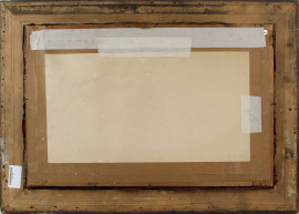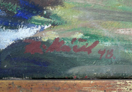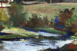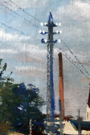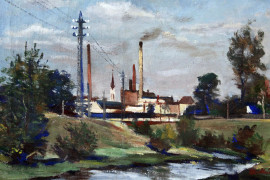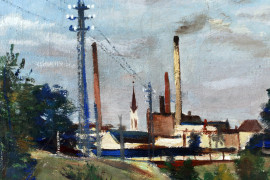 Paesaggio con fabbrica, olio su tela riportata su tavola, datato e firmato in basso a destra, cm 42x60,5, realismo socialista, XX secolo, entro cornice, (piccole cadute di colore)