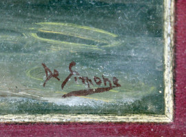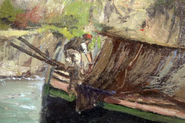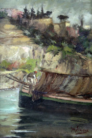 Paesaggio con imbarcazione e pescatore, olio su tela, cm 22x15, firmato, entro cornice.