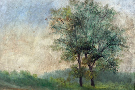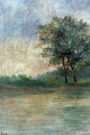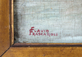 Paesaggio fluviale con albero, olio su tavola, cm 37x27, firmato Frascaroli Flavio, entro cornice