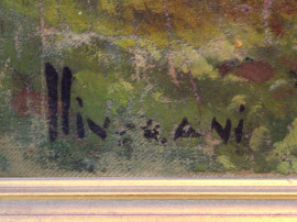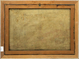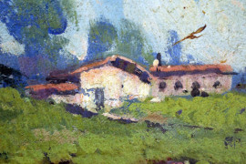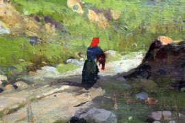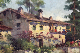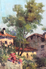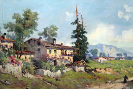 Paesaggio montano con case e figura, olio su tela, cm 59x82, firmato Liverani, entro cornice