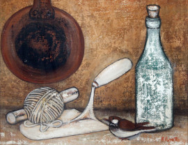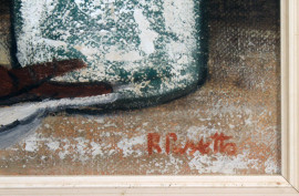Bottiglie, olio su tela, cm. 60x50, firmato e datato a tergo, entro cornice.
