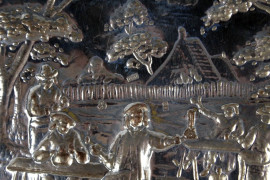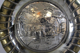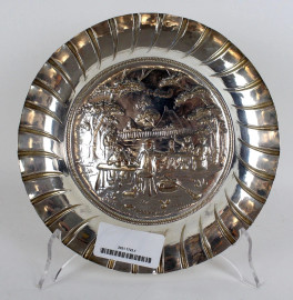 Piatto tondo in argento sbalzato, con decoro raffigurante scena contadina, Bolli Russia, diametro cm 23, gr. 317