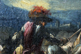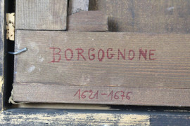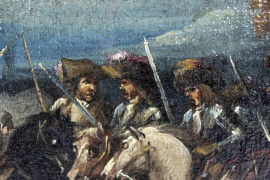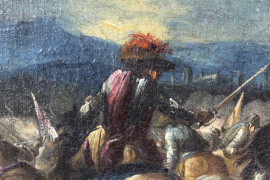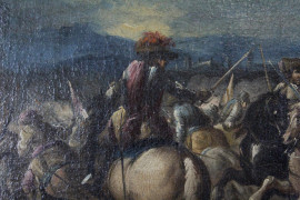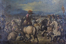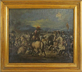 Pittore del XVII secolo, Battaglia tra cavalieri turchi e cristiani, olio su tela, cm. 33x39,5, entro cornice.