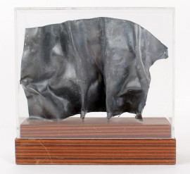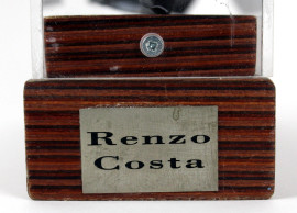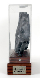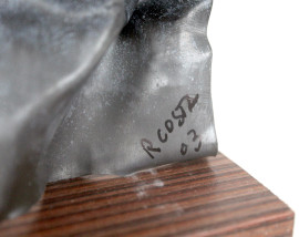 R. Costa, scultura in metallo, entro teca, misure max cm 18,5x19x6,5, XX secolo.