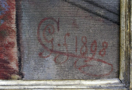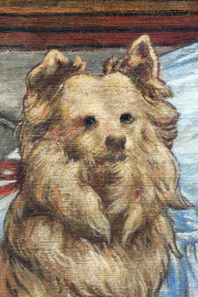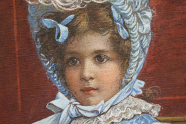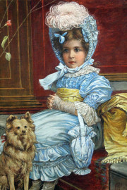 Ritratto di bambina con cane, olio su tela, cm 86x62, siglato e datato 1898, entro cornice.