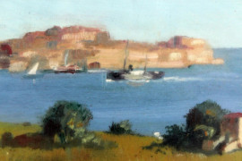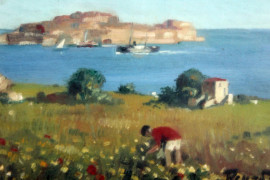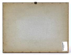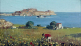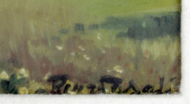 Scorcio di costa con prato e figura, olio su cartone, cm. 14x24, firmato, entro cornice.