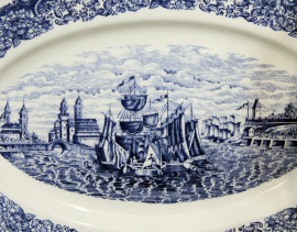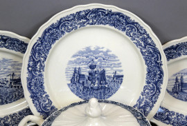 Servizio di piatti in ceramica Laveno, decoro a motivo di paesaggi marini, (sbeccature e difetti).